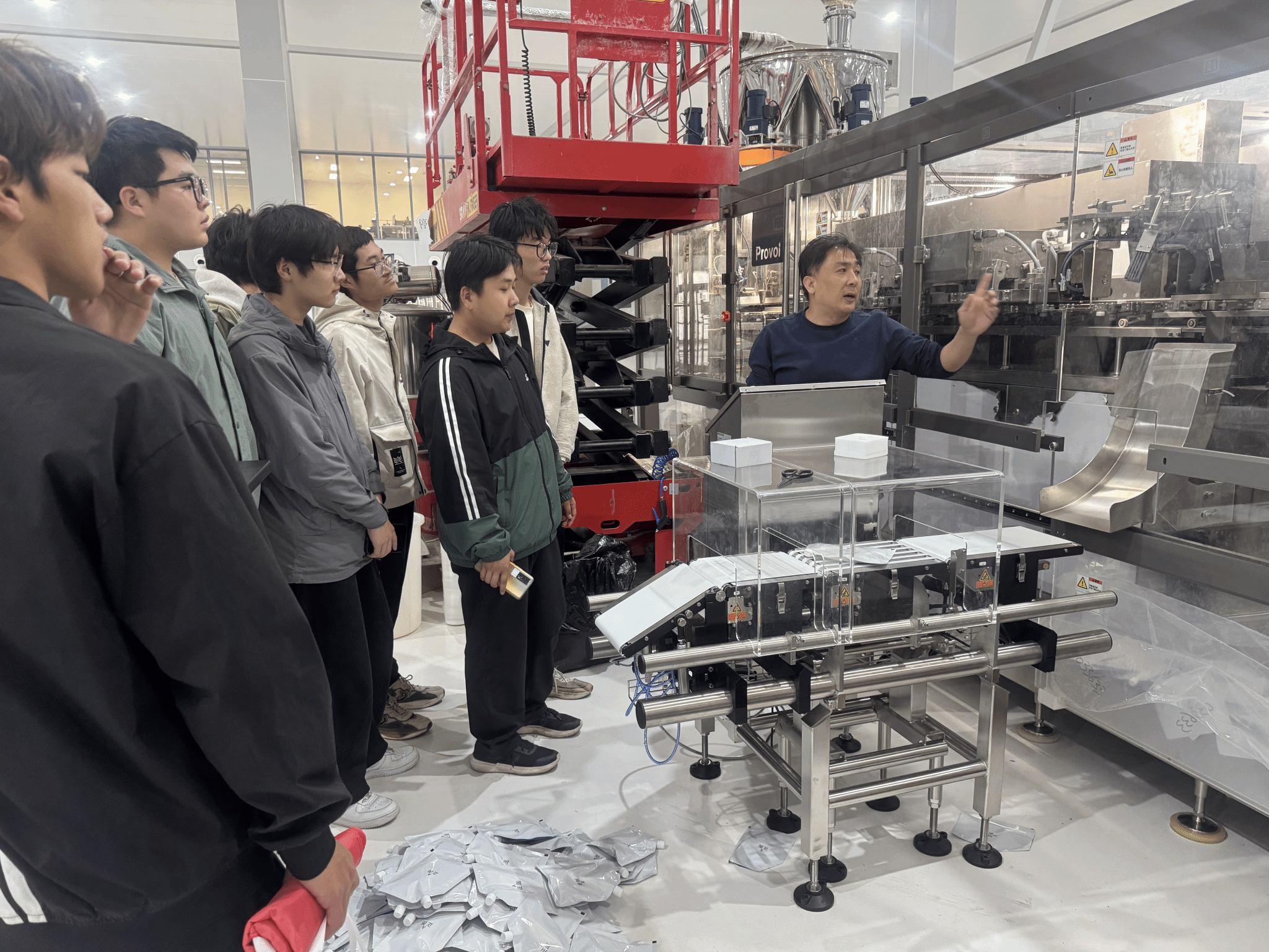 实习期间,学生们深入企业生产一线,参观了自动化生产线、智能装备制造车间以及产品研发中心等区域。在郎锐包装技术有限公司工作人员的带领下,学生们首先参观了公司的生产车间。车间内,先进的生产设备有序运转,自动化生产线高效运行,展现出智能工厂的强大实力。公司研发的高速柔性预制袋包装设备令人印象深刻,这款设备其集聚高速、柔性、低耗、运行稳定等特点于一身,可实现极致产能、柔性换产等高性能,投入市场后获得了客户的高度认可和信赖。