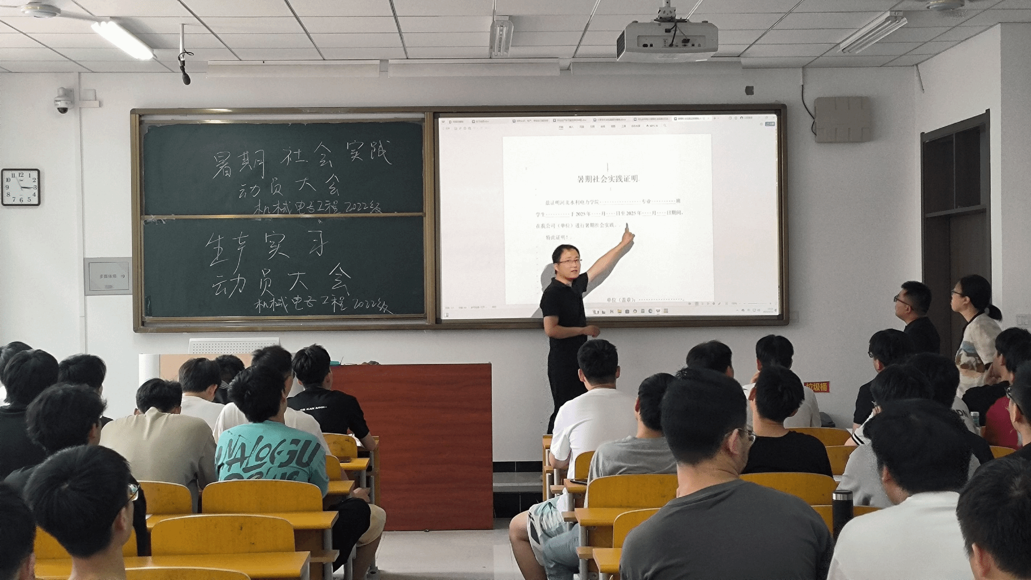 2025年6月13日下午,英国365上市集团机电教研室在2C204教室召开2025年生产实习及暑期社会实践动员大会。本次会议旨在动员机械电子工程专业81名同学积极参与为期三周的生产实习和为期一周的暑期社会实践,为同学们搭建理论与实践结合的成长平台。