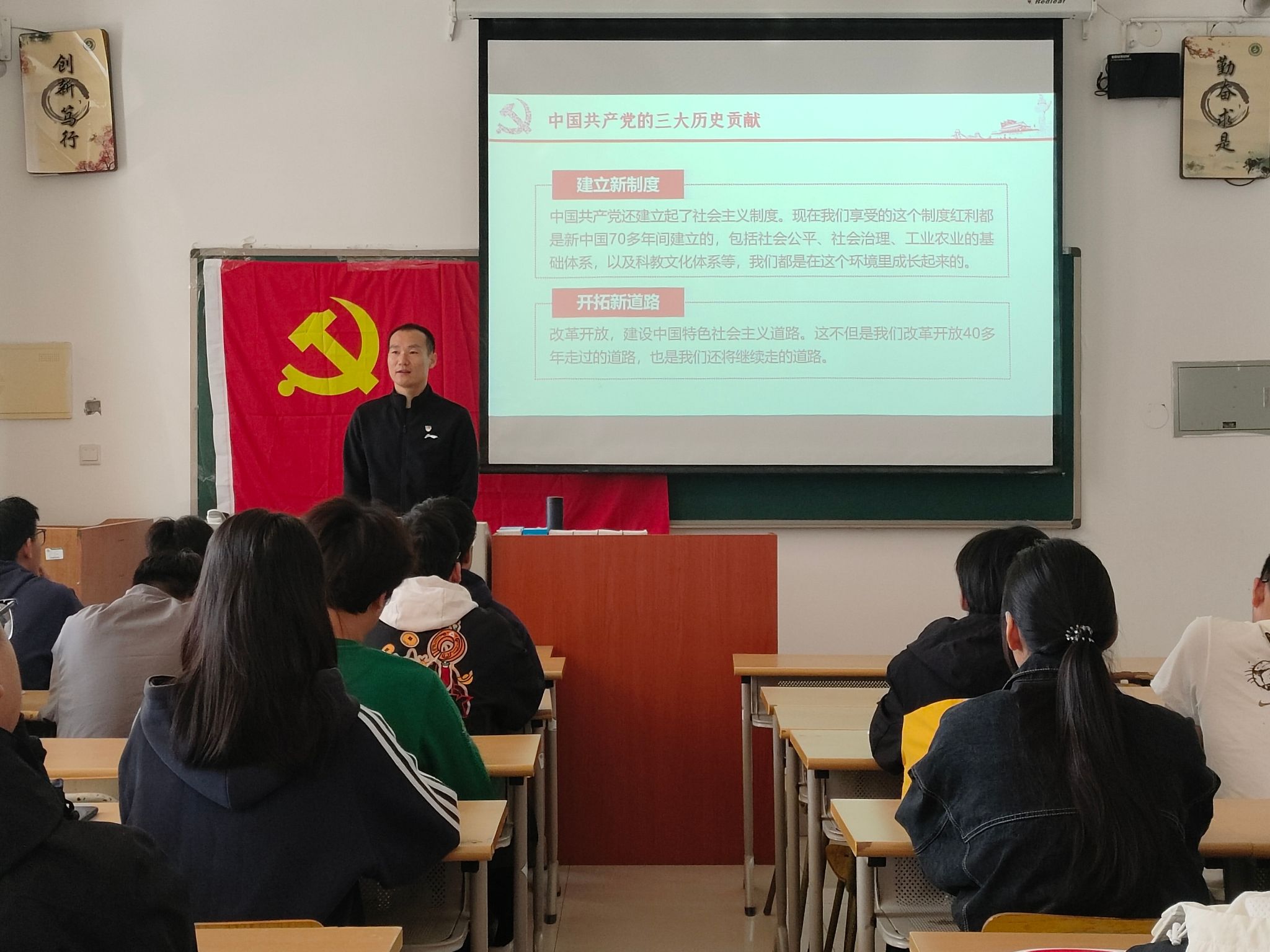 杨学智老师从中国共产党的三大历史贡献、党员的八项权利等方面引出:在向党组织积极靠拢的过程中,树立正确的入党动机是争取入党的首要表现,共产党员不仅要在组织上入党,更要从思想上入党。正确的入党动机是思想上入党的根本问题,它从根本上决定了每一个党员的素质和行为,是共产党党员的世界观、人生观、价值观的集中反映。他要求同学们要进一步提高思想认识,加强政治理论学习,用理论武装头脑,指导行动,努力提升政治素养,增强行动自觉,以一名党员的标准严格自己。