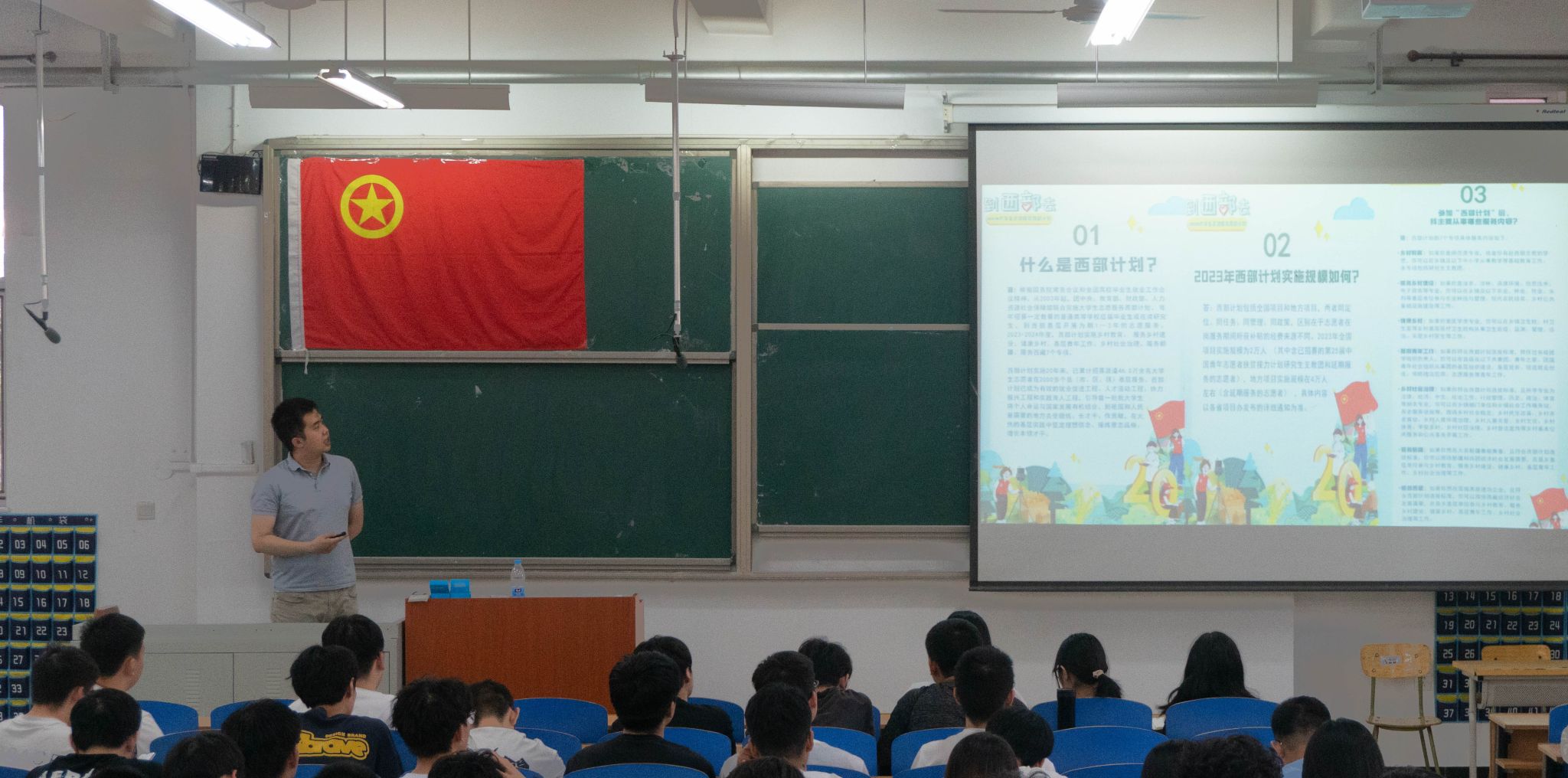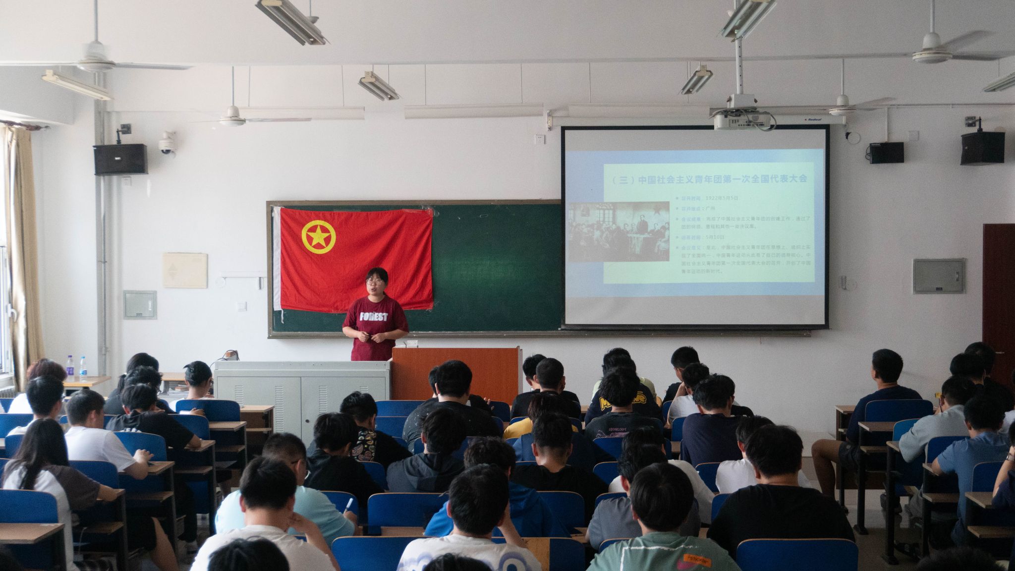 团课上,系党总支副书记杨学智以“百年团史与青年奋斗”为主题,以青年团的三个主要发展阶段为切入点,从1920年8月社会主义青年团在上海的建立,到1925年1月召开的中国社会主义青年团第三次全国代表大会上“中国共产主义青年团”名字的确定,到现在党的十一届三中全会之后,共青团跟着党走上改革开放道路,焕发新的生机。一百年来,中国共产党领导中华民族复兴伟业劈波斩浪、壮丽远航,中国共青团团结带领一代代中国青年奋勇争先,在党的事业和民族复兴征程中,书写了无上的青春荣光。