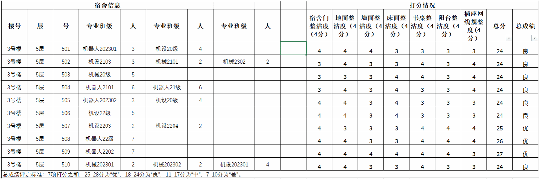 为了进一步加强宿舍卫生管理,我系自律部于9月25日开展了第二次宿舍卫生检查,现将各寝室卫生检查状况公示如下: