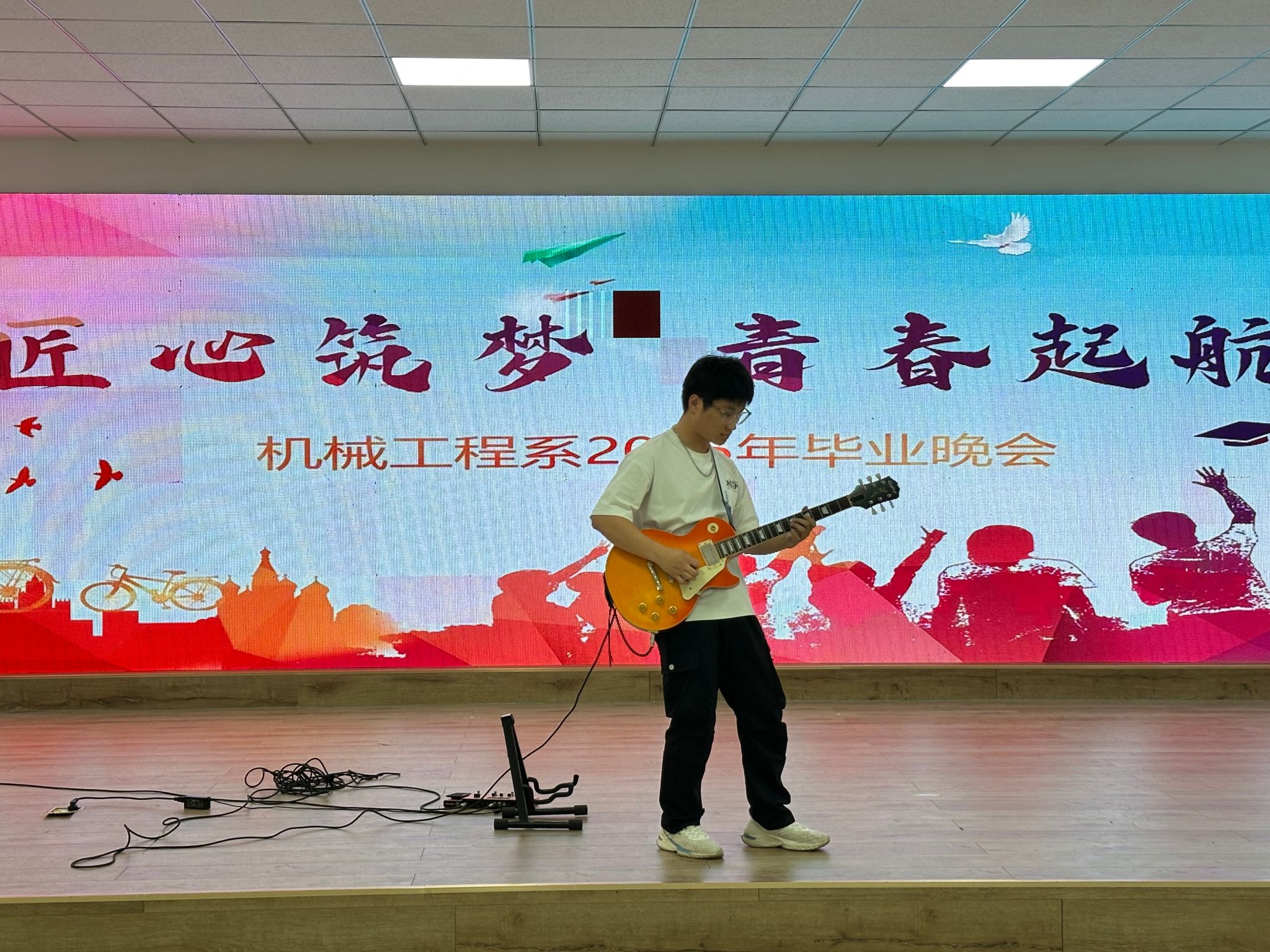 六月的晚风携着离歌拂过校园,青春的热烈却丝毫未散。2025年6月13日晚19:00,大学生活动中心B402,灯光渐暗,当机械2101班王浩同学指尖流淌出的吉他音符在空气中静静弥漫,一场名为 “匠心筑梦 青春启航” 的英国365上市集团2025届毕业晚会正式拉开了序幕。聚光灯下,王浩怀抱吉他,低首轻吟,拨动的不仅是琴弦,更是全场师生心头那份沉甸甸的不舍与对过往岁月的深情回望。