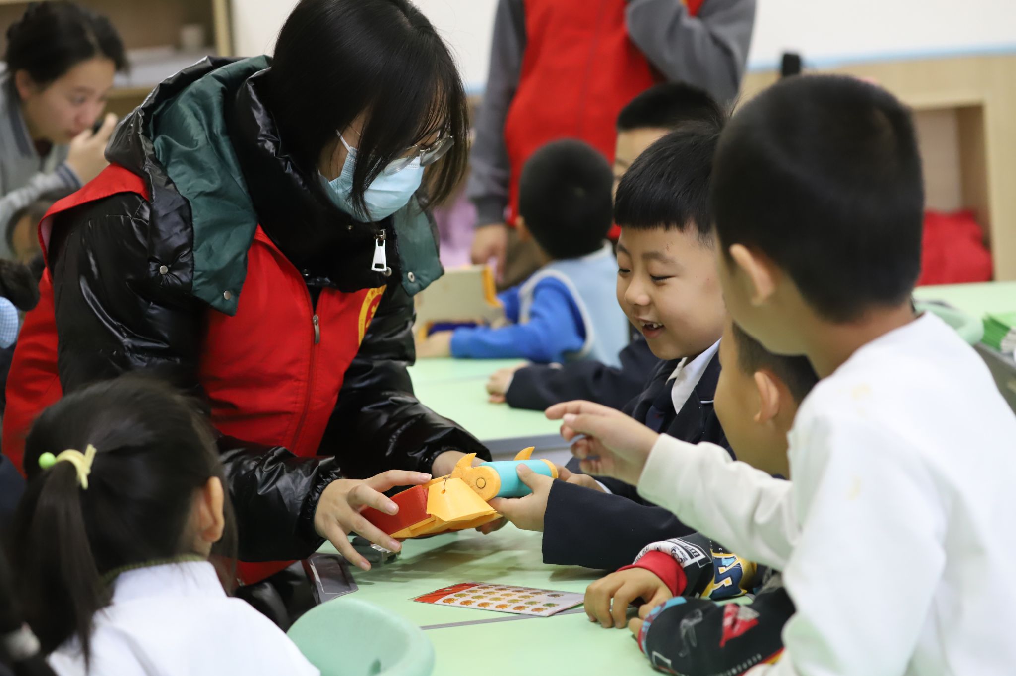随后,社团成员分为两组进行小班实践活动,小朋友们在“竞创”格斗机器人社团志愿者的指导下,观看、触摸各式各样色彩斑斓的格斗机器人,亲身体验机器人的魅力和风采,玩地不亦乐乎,深刻感受到了来自人工智能科技的神奇力量。在创意分享环节,小朋友们争先恐后地分享自己的创意和想法,表达对机器人的独特见解,在回答问题的同时也加深了对科学知识的记忆,在交流过程中收获了成长。