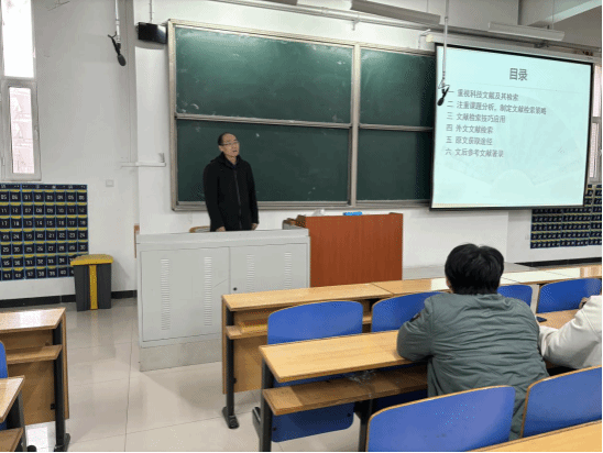 讲座开始,张晓雨老师介绍了田副馆长多年来从事图书馆工作的经历,对如何正确、高效使用文献检索有着丰富的经验和独到的见解。随后,田崇振馆长从重视科技文献及其检索、制定文献检索策略、文献检索技巧应用、外文文献检索、原文获取途径、文后参考文献著录等几个方面,为同学们进行了精彩的演讲。