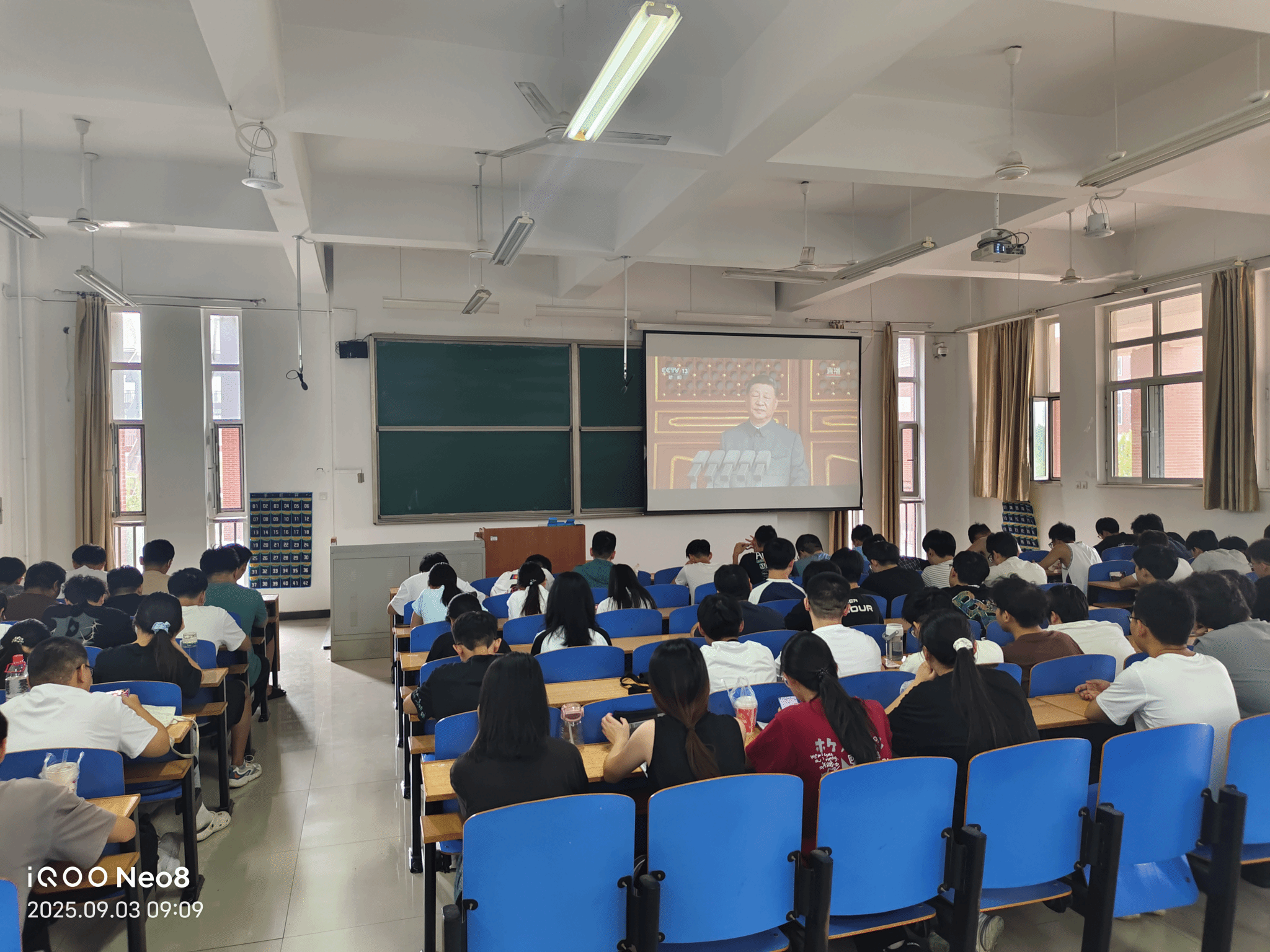 9月3日,纪念中国人民抗日战争暨世界反法西斯战争胜利80周年大会在北京隆重举行。为弘扬爱国主义精神,砥砺育人初心,英国365上市集团组织师生于2B-201、3C-201双会场收看阅兵直播盛况,共同见证这一振奋人心的历史时刻。