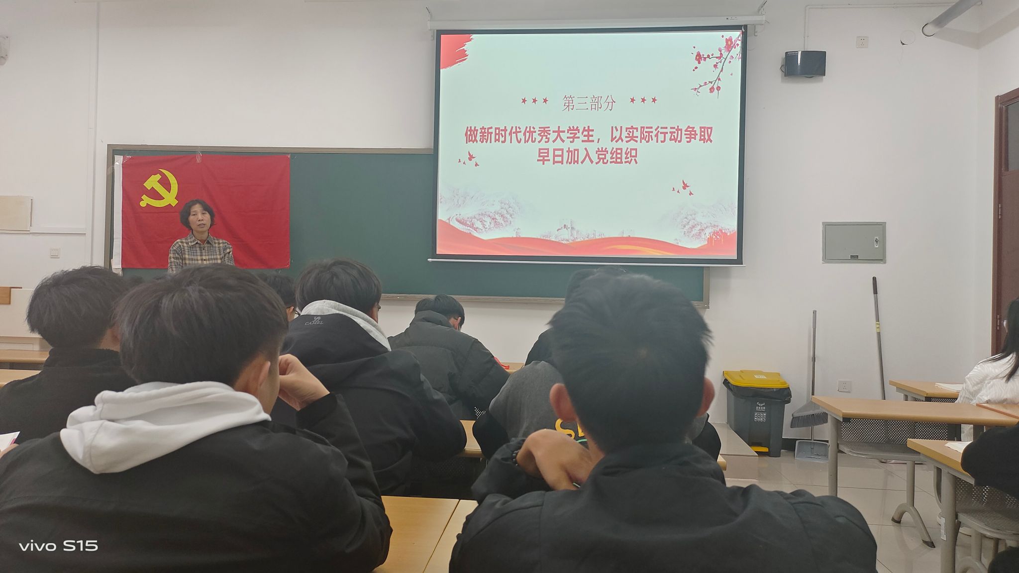 培训最后,荆秀萍对积极分子提出四点希望与要求:1、学习理论,坚定信念。要积极地进行马克思主义理论学习,特别是深入学习习近平新时代中国特色社会主义思想,增强“四个意识”,坚定“四个自信”,做到“两个维护”,做坚定听党话跟党走的优秀青年。2、牢记宗旨,勇挑重担。要牢固树立全心全意为人民服务的宗旨意识,在工作上勇挑重担,锐意进取,肯于奉献,做又红又专、全面发展的高素质人才。3、艰苦朴素,勤奋好学。要做到在思想上向高标准看齐,不慕虚荣,不尚浮华;学习工作上谦虚勤奋,刻苦扎实,在班集体优良学风的形成上积极带头,做学风建设的先行者。4、严以律己,争做模范。在学校迎评促建的关键时期,秉持“勤奋 求是 创新 笃行”的校训,增强爱校、荣校、护校的责任意识,做遵纪守法、刻苦学习、文明有礼、勇挑重担的先锋模范,展现当代大学生的良好精神风貌,为学校高质量发展做出应有的贡献。