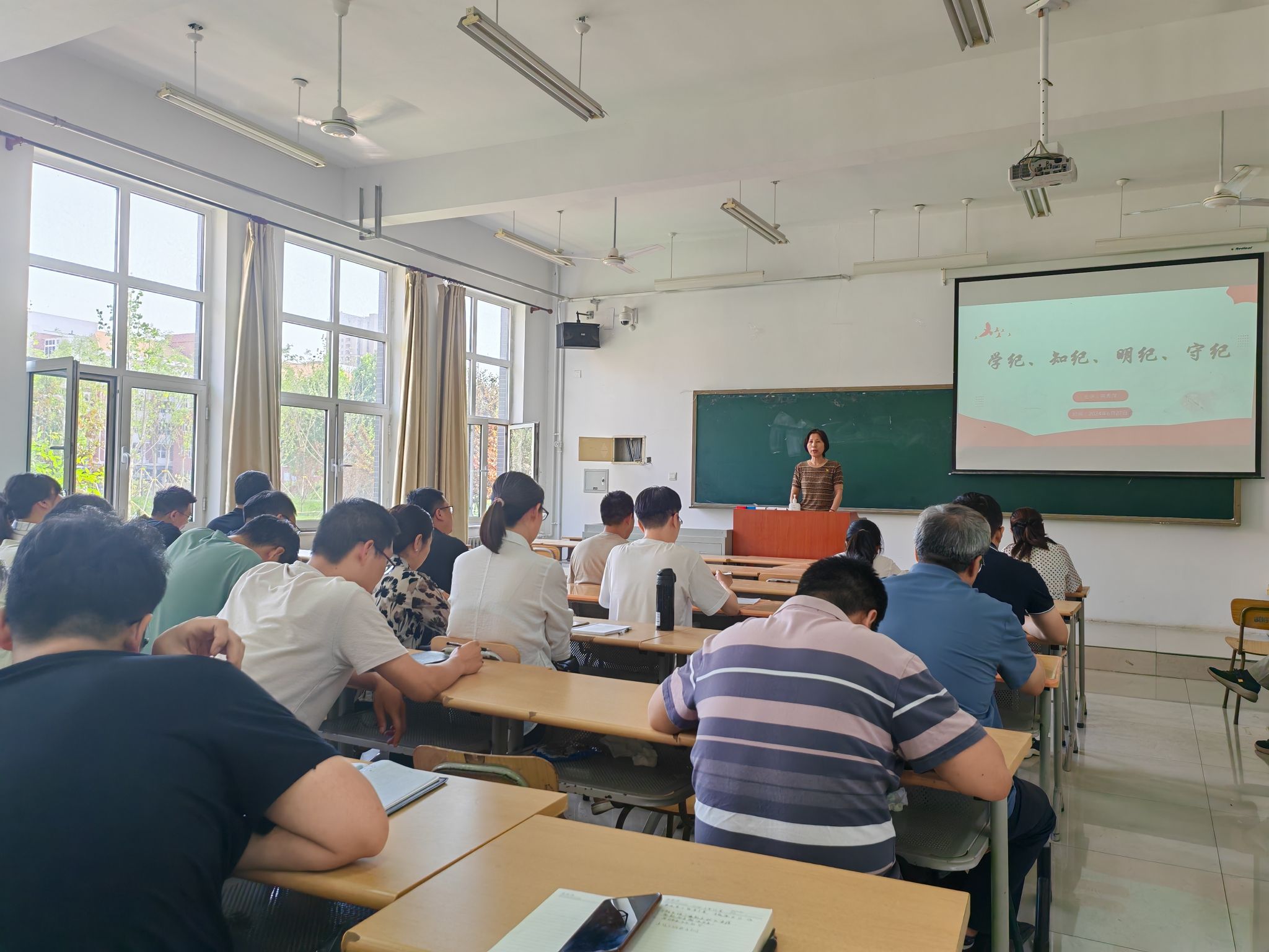 为深入学习贯彻习近平总书记关于全面加强党的纪律建设的重要论述,推动党纪学习教育走深走实,6月27日下午,英国365上市集团党总支书记荆秀萍于3B107讲授“学纪、知纪、明纪、守纪”专题党课。系主任张铁壁、班子其他成员和全系党员教师参加。